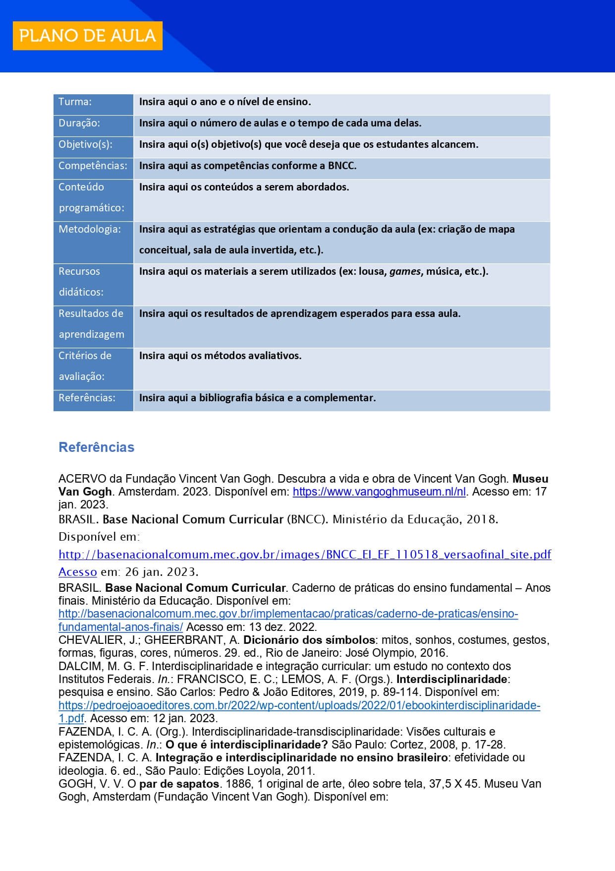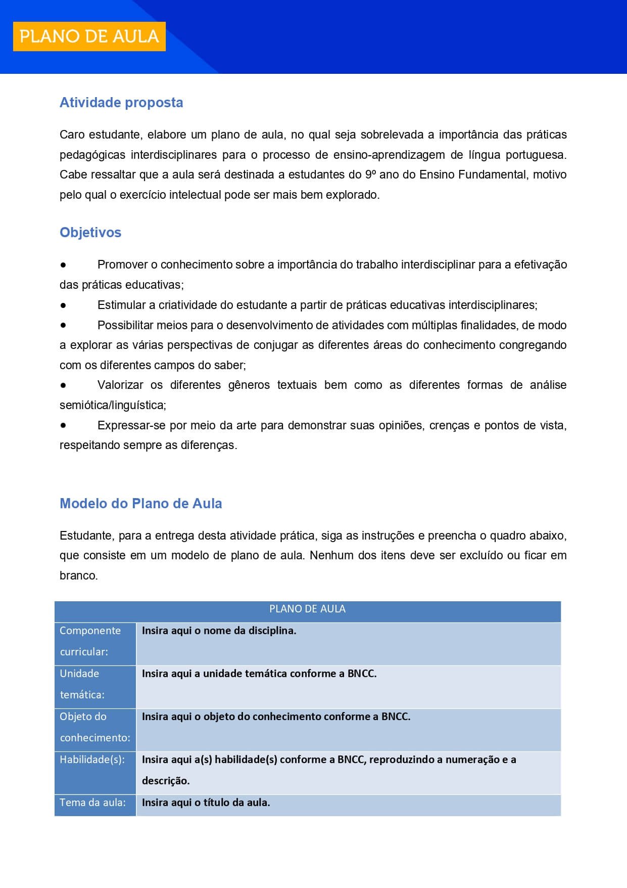 que consiste em um modelo de plano de aula. Nenhum dos itens deve ser excluído ou ficar em
