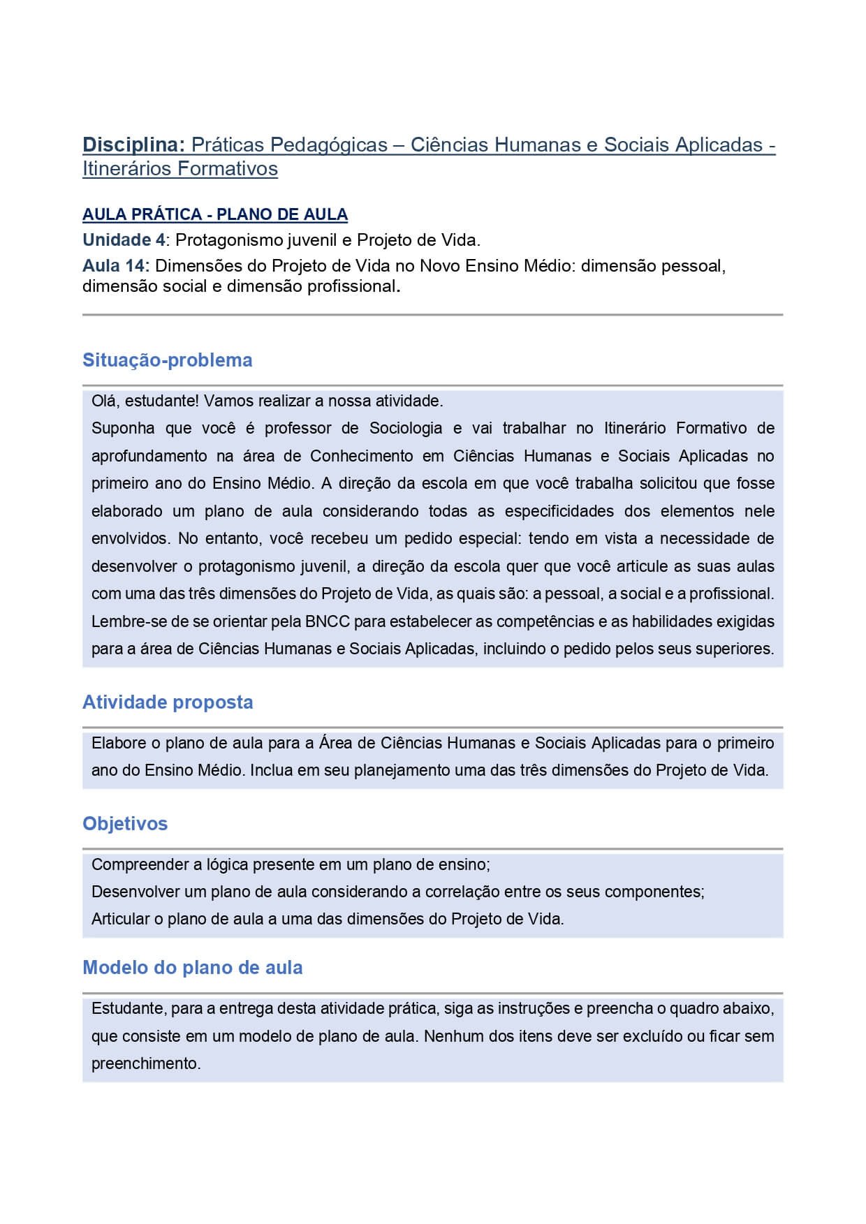 Disciplina: Práticas Pedagógicas – Ciências Humanas e Sociais Aplicadas –