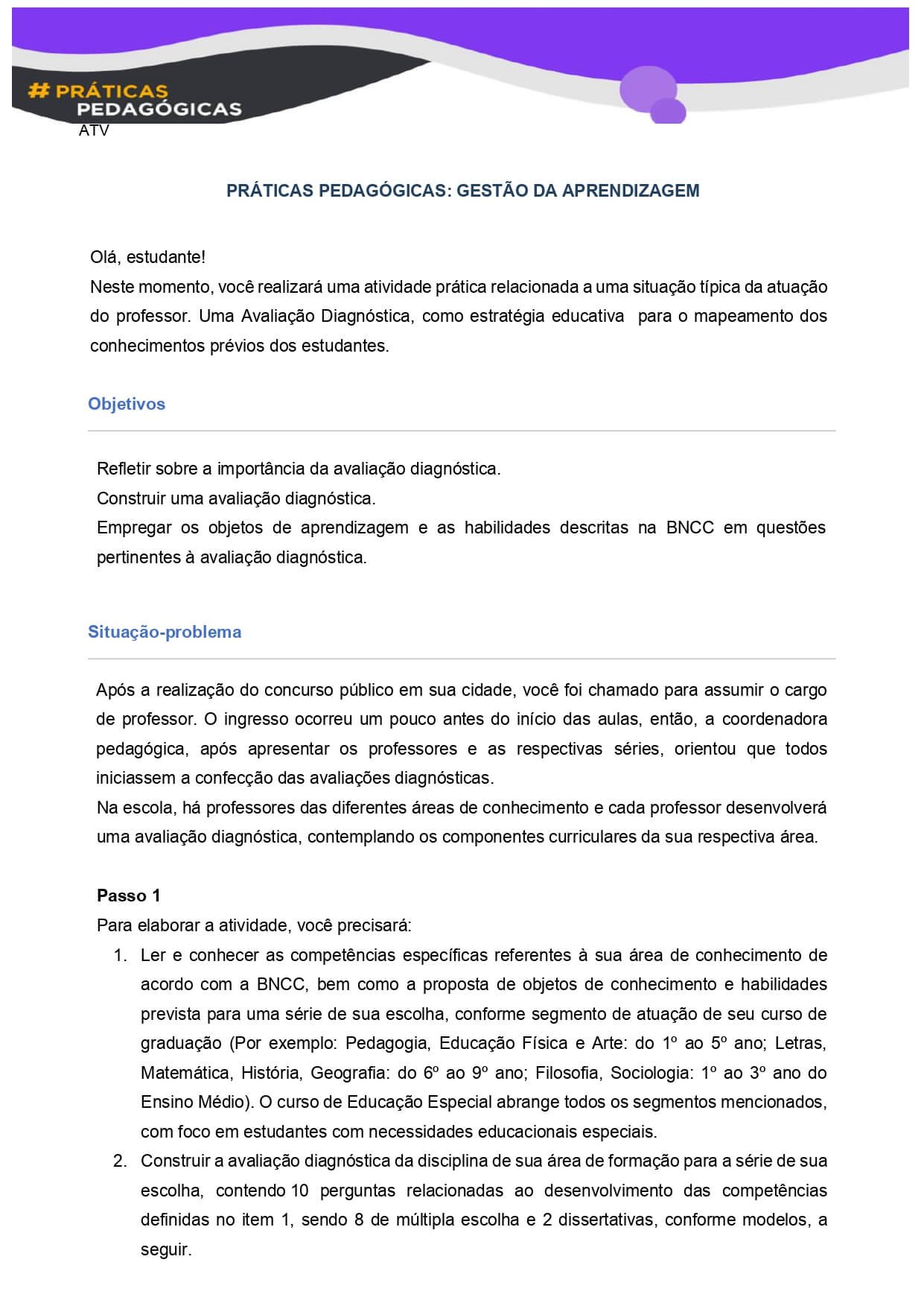 2. Construir a avaliação diagnóstica da disciplina de sua área de formação para a série de sua