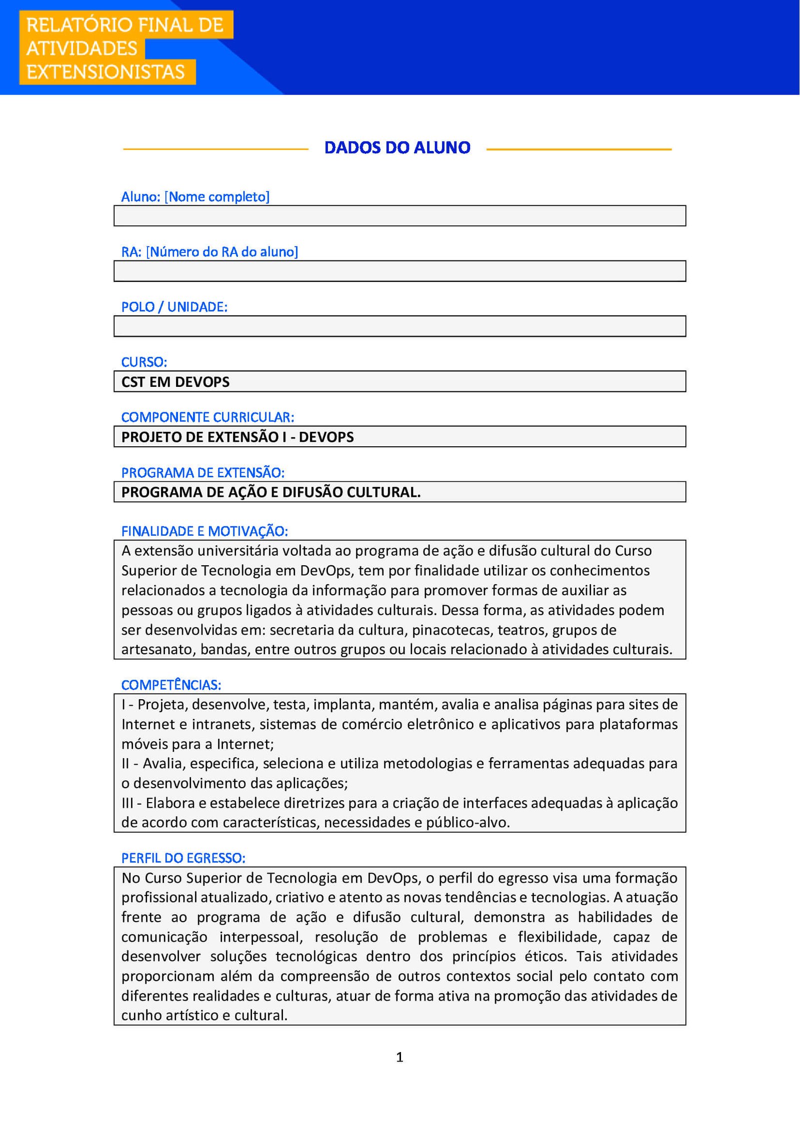 | Aluno e Aluna, após realizar suas atividades de extensão, é necessário que você o formalize, enviando esse Relatório Final para ser avaliado junto ao seu Ambiente Virtual (AVA) e também para você poder comprovar sua atuação. Para o preenchimento, busque as anotações junto ao TEMPLATE PCDA para auxiliar na apresentação das atividades desenvolvidas. Todos os campos são de preenchimento obrigatório! | ||||||||||