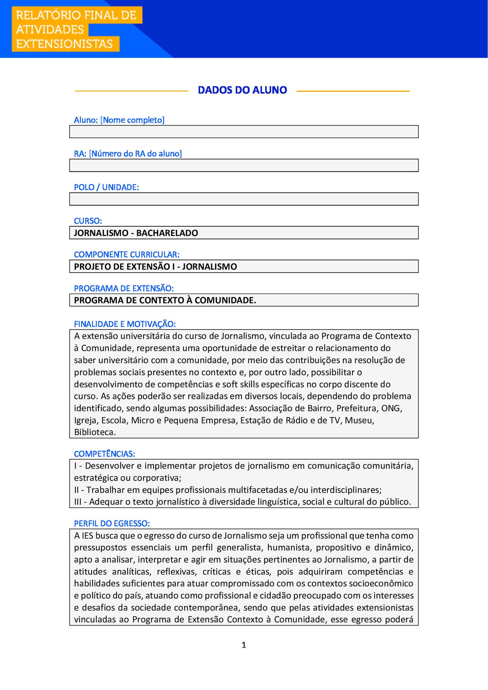 | A extensão universitária do curso de Jornalismo, vinculada ao Programa de Contexto à Comunidade, representa uma oportunidade de estreitar o relacionamento do saber universitário com a comunidade, por meio das contribuições na resolução de problemas sociais presentes no contexto e, por outro lado, possibilitar o desenvolvimento de competências e soft skills específicas no corpo discente do curso. As ações poderão ser realizadas em diversos locais, dependendo do problema identificado, sendo algumas possibilidades: Associação de Bairro, Prefeitura, ONG, Igreja, Escola, Micro e Pequena Empresa, Estação de Rádio e de TV, Museu, Biblioteca. | ||||||||||