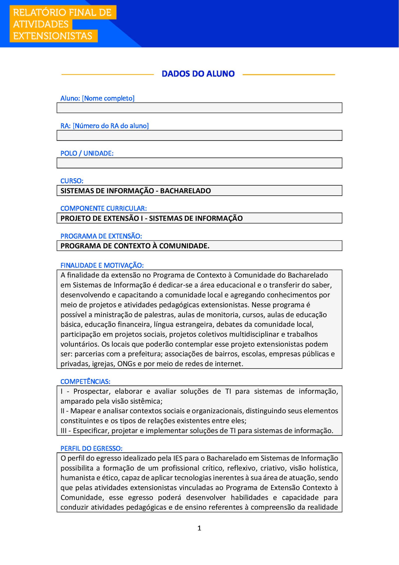 Aluno e Aluna, após realizar suas atividades de extensão, é necessário que você o formalize, enviando esse Relatório Final para ser avaliado junto ao seu Ambiente Virtual (AVA) e também para você poder comprovar sua atuação.