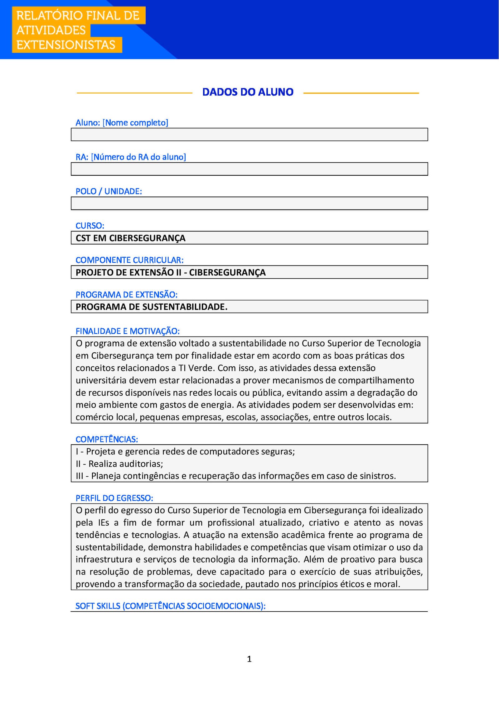 Aluno e Aluna, após realizar suas atividades de extensão, é necessário que você o formalize, enviando esse Relatório Final para ser avaliado junto ao seu Ambiente Virtual (AVA) e também para você poder comprovar sua atuação.