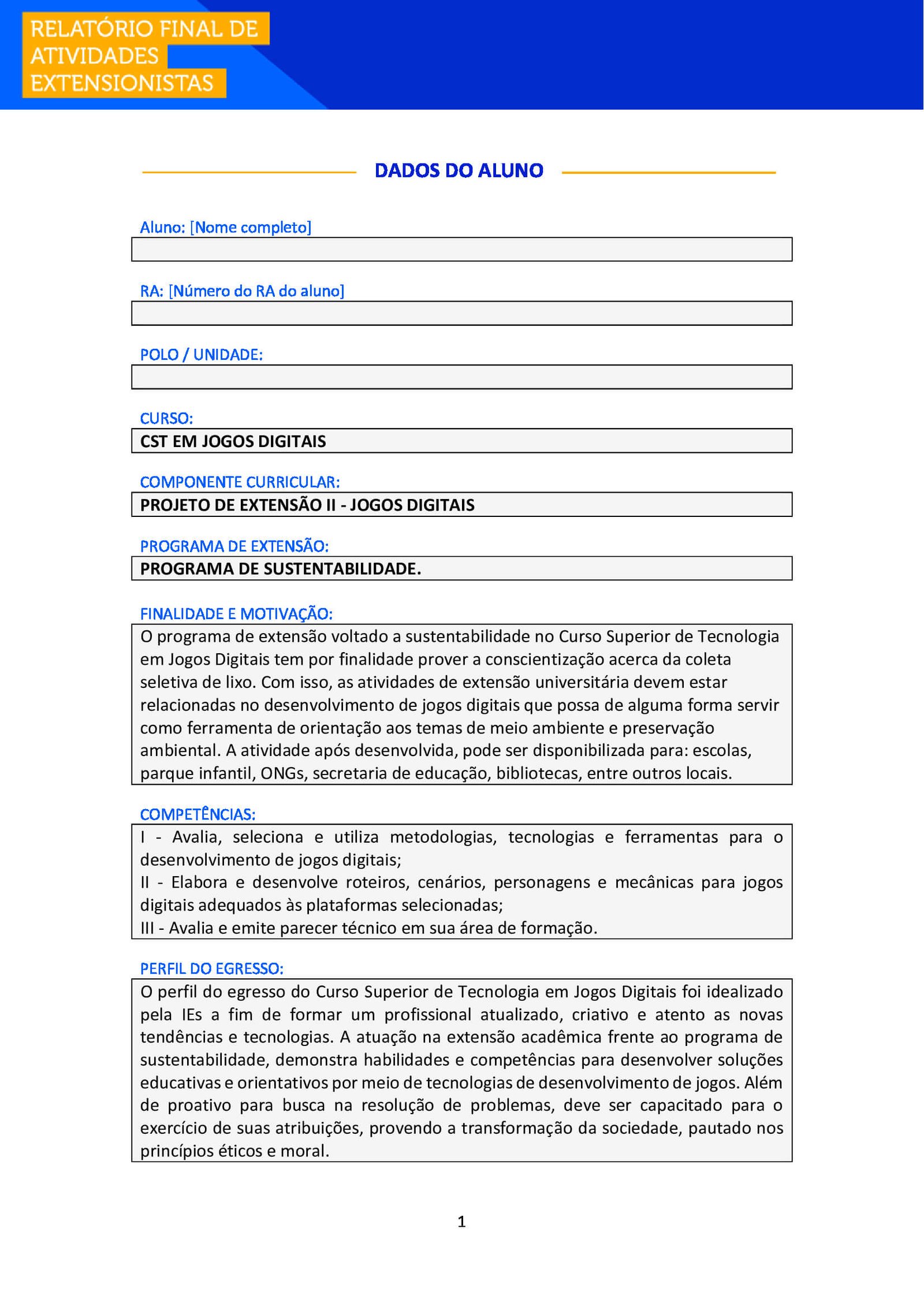 Aluno e Aluna, após realizar suas atividades de extensão, é necessário que você o formalize, enviando esse Relatório Final para ser avaliado junto ao seu Ambiente Virtual (AVA) e também para você poder comprovar sua atuação.