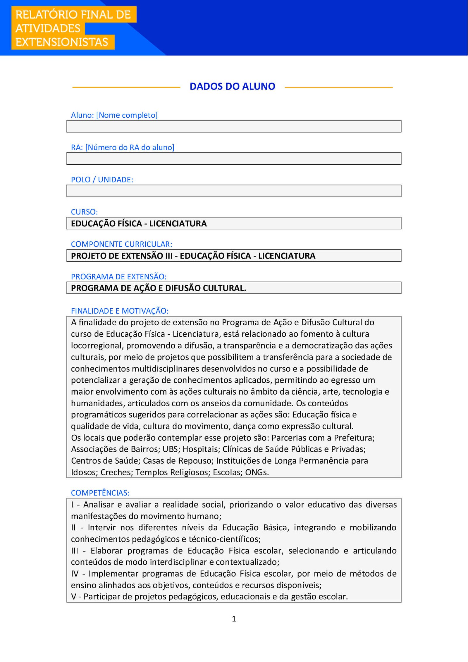 Aluno e Aluna, após realizar suas atividades de extensão, é necessário que você o formalize, enviando esse Relatório Final para ser avaliado junto ao seu Ambiente Virtual (AVA) e também para você poder comprovar sua atuação.