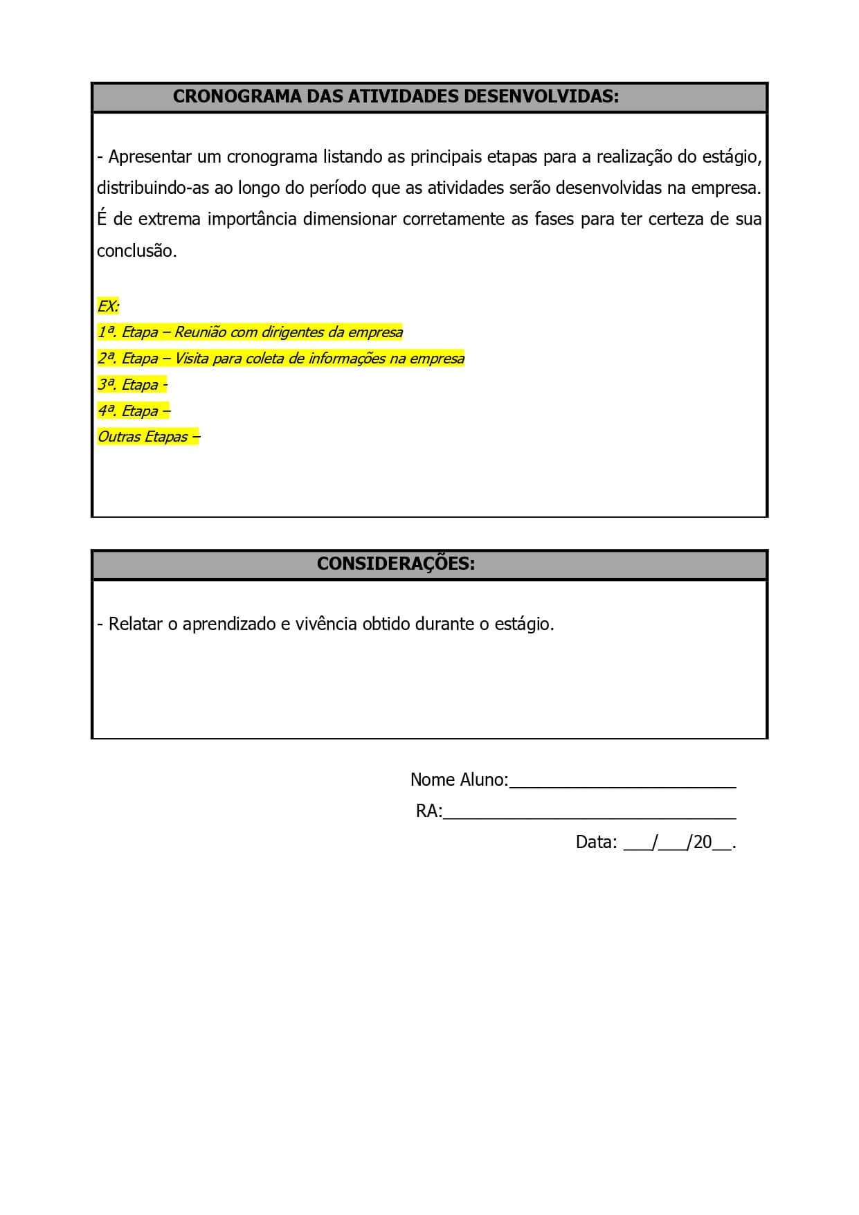 | – Apresentar um cronograma listando as principais etapas para a realização do estágio, distribuindo-as ao longo do período que as atividades serão desenvolvidas na empresa. É de extrema importância dimensionar corretamente as fases para ter certeza de sua conclusão. EX: 1ª. Etapa – Reunião com dirigentes da empresa 2ª. Etapa – Visita para coleta de informações na empresa 3ª. Etapa – 4ª. Etapa – Outras Etapas – |